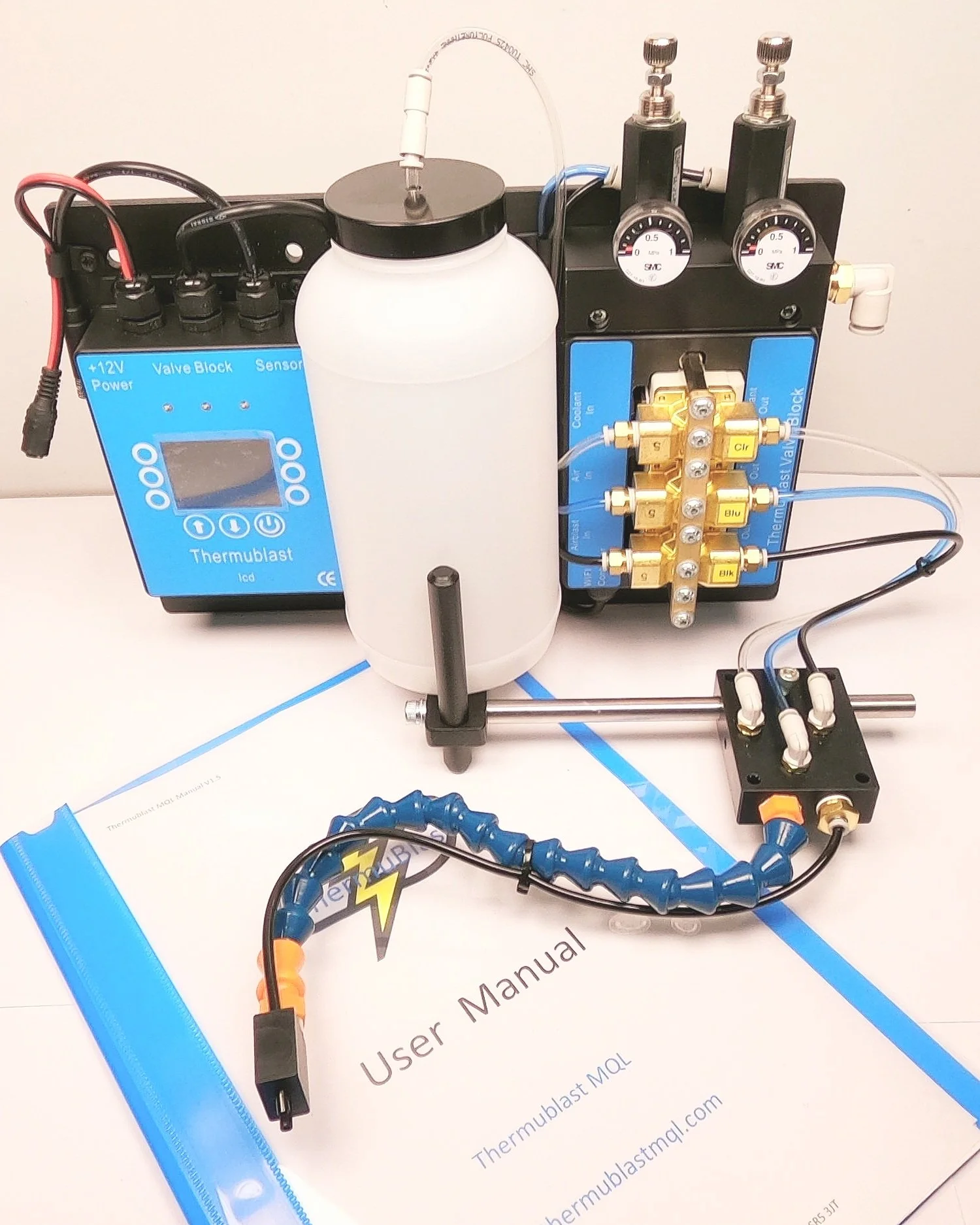 Precision(Microprocessor controlled) pulsed spray cooling and lubrication plus airblast chip clearing. All without misting or fogging. A low cost, low mess alternative to flood coolant on machine tools such as mills, lathes, grinders, saws and so on.